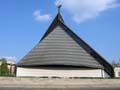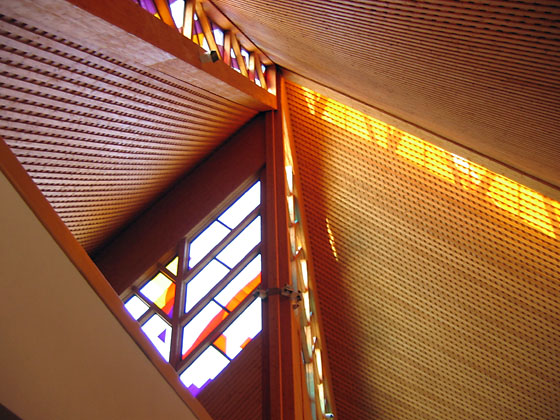 Chrám je trojboký jehlan, přičemž jeho vnitřní prostor je polovinou tohoto jehlanu. Půdorys je rovnoramenný trojúhelník. V rozích chrámu jsou dvě okna. Vitráž vlevo u křtitelnice představuje sv. Wolfganga (dar biskupství Regensburg, autor Josef Guggenberger). Vpravo je sv. Anežka Česká (autorka Jaroslava Fenzlová). Křtitelnice má zvláštní charakter – tvoří ji tři bloky pískovcových kvádrů. Jako Mojžíš vyvedl vodu ze skály pro záchranu izraelského národa před smrtí žízní, tak křestní voda zachraňuje pro věčný život.